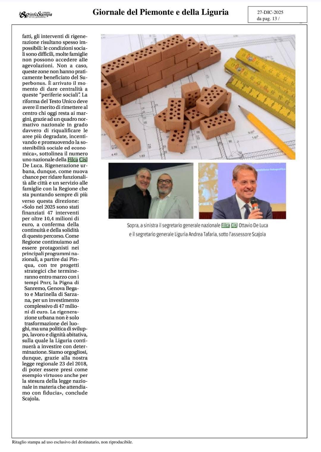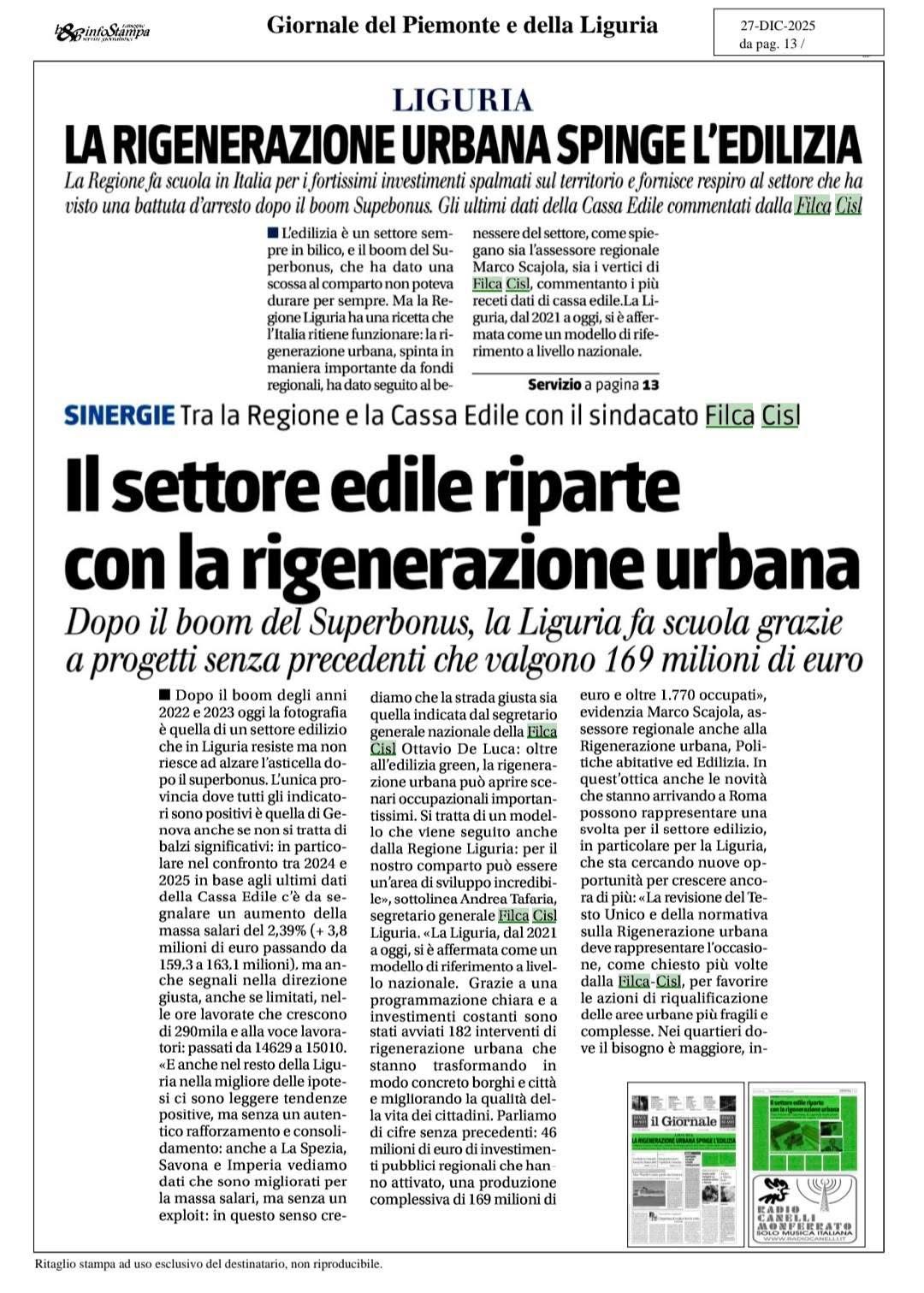 In quest’ottica anche le novità che stanno arrivando a Roma possono rappresentare una svolta per il settore edilizio, in particolare per la Liguria, che sta cercando nuove opportunità per crescere ancora di più: “La revisione del Testo Unico e della normativa sulla Rigenerazione urbana deve rappresentare l’occasione, come chiesto più volte dalla Filca-Cisl, per favorire le azioni di riqualificazione delle aree urbane più fragili e complesse.